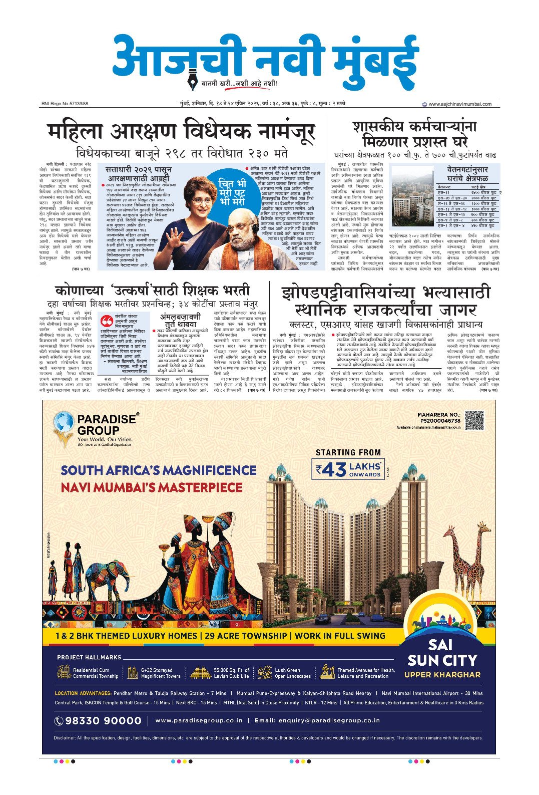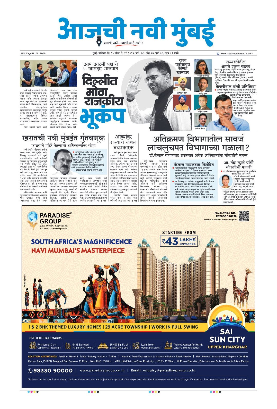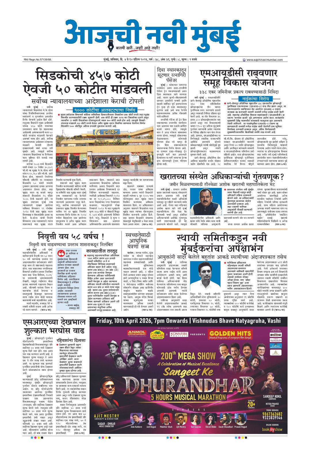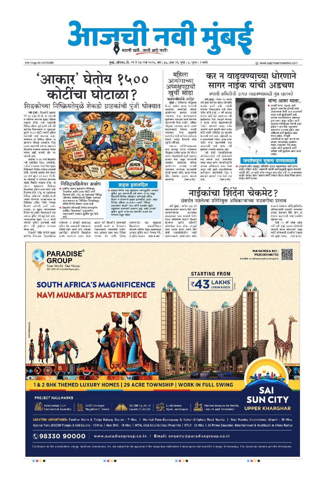 नैना क्षेत्रातील 6160 कोटींची कामे ठप्प मिस्त्री गृहप्रकल्प सीआरझेडच्या रडारवर? ‌‘त्या‌’ कामकाजाची श्वेतपत्रिका काढणार राजकर्त्यांचा नवी मुंबईकरांच्या आरोग्याशी खेळ नवी मुंबईत कचऱ्यापासून वीजनिर्मिती प्रकल्प बेलापुर मतदारसंघात कोणाचा करिष्मा औद्योगिक जमिनीवर रहिवाशी वापरास परवानगी बेलापुर मतदारसंघातून मिळणार आघाडी-आमदार मंदा म्हात्रे पोशिर धरणातून 500 एमएलडी पाण्याची नवी मुंबईसाठी तरतूद नियोजनाअभावी नवी मुंबई शहराचे भवितव्य धोक्यात! शिवशक्तीचा कर्तव्यनामा जाहीर भारताच्या खाद्य संस्कृतीला जागतिक मान भाजपचे सहा उमेदवार बिनविरोध पालिकेत ठराविक घराण्यांची सुभेदारी! महापालिकेत 60 कोटींचा एफएसआय घोटाळा ऐरोली मतदारसंघात शिवसेनेचा जोर शरद पवार गटाच्या महिला जिल्हाध्यक्ष सलुजा सुतार भाजपात नवी मुंबईत काका-दादा एकत्र पालिकेकडून आर्थिक दुर्बल व अल्प उत्पन्न घटकांची उपेक्षा शिवसेनेतील गटबाजीचा भाजपला फायदा 21 लाखांचे अंमली पदार्थ जप्त व्हॅली गोल्फ कोर्समध्ये रंगली आंतरराष्ट्रीय गोल्फ स्पर्धा शिंदेसेनेची समन्वय समिती जाहीर निवडणुकीसाठी पालिकेची तयारी महिला सक्षमीकरणाकडे महापालिकेचे पाऊल 18 विकासकांवर बांधकाम स्थगितीची कारवाई कुंडेवहाळ, बंबावे गावातील शेतजमीनींचे पुनर्मूल्यांकन करण्याची मागणी ‌‘नवी मुंबई प्रॉपर्टी एक्स्पो‌’ चा धमाका जगातील सर्वात मोठा जीसीसी मुंबईत उभारणार घरांचे दर कमी करण्यासाठी सरकारचा पुढाकार कोल्हापुरी चपला जगभरात पोहचणार 5 उद्यानांमध्ये सोलार ट्री प्रकल्प पहिल्या विमानोड्डाणापुर्वी नामकरणाची मागणी नवीन चार कामगार कायदे लागू शिवछत्रपतींच्या सिंहासनारुढ पुतळ्याचे अनावरण सिडकोची 4508 घरांची लॉटरी आयकॉनिक शहर विकास धोरण मंजूर एक तपानंतर अमेयचा संघर्ष संपुष्टात तळोजा-कामोठे पालिका उभारणार शिक्षण संकुल नेरुळ रुग्णालयात अत्याधुनिक मायक्रोबायलॉजी प्रयोगशाळा ख्रिसमसच्या मुहूर्तावर पहिले विमान उडणार 8 हजार सरकारी कर्मचाऱ्यांनी लाटले लाडकी बहीणचे पैसे अंगणवाडी सेविकांना दोन हजारांची भाऊबीज अनधिकृत मालमत्तांची दस्त नोंदणी सिडको घरांच्या किंमतीवर लवकरच तोडगा जेएनपीएमध्ये धावणार विद्युत वाहने हिरानंदानी समुहावर अवमानना याचिका 26 कोटींचे अमली पदार्थ भस्म माथाडींना नियमात जे बसेल ते सर्व दिले जाईल सानपाडा पोलीस ठाणे इमारतीचे उद्घाटन सिडकोमध्ये हिरकणी कक्ष उपक्रम सुरु विशेष सेवापदक प्राप्त पोलीसांचा गौरव नैना व तिसऱ्या मुंबईसाठी पुणे पॅटर्न? सर्वोच्च न्यायालयाचे आदेश उलगडणार विजयाचे रहस्य ‌‘वाहतूक झोन‌’ मधील एल ॲण्ड टी चा गृहप्रकल्प पुन्हा वादात स्वच्छतामित्रांचा विशेष सन्मान सार्व